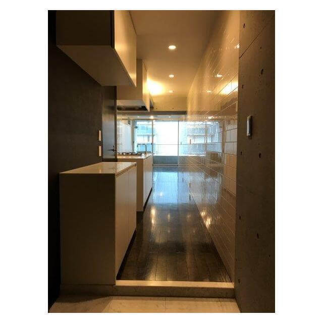 エレベーターホールから玄関までは以下の写真のように、コンクリート打ちっぱなしのデザインが目を引く、おしゃれな内廊下仕様となっています。