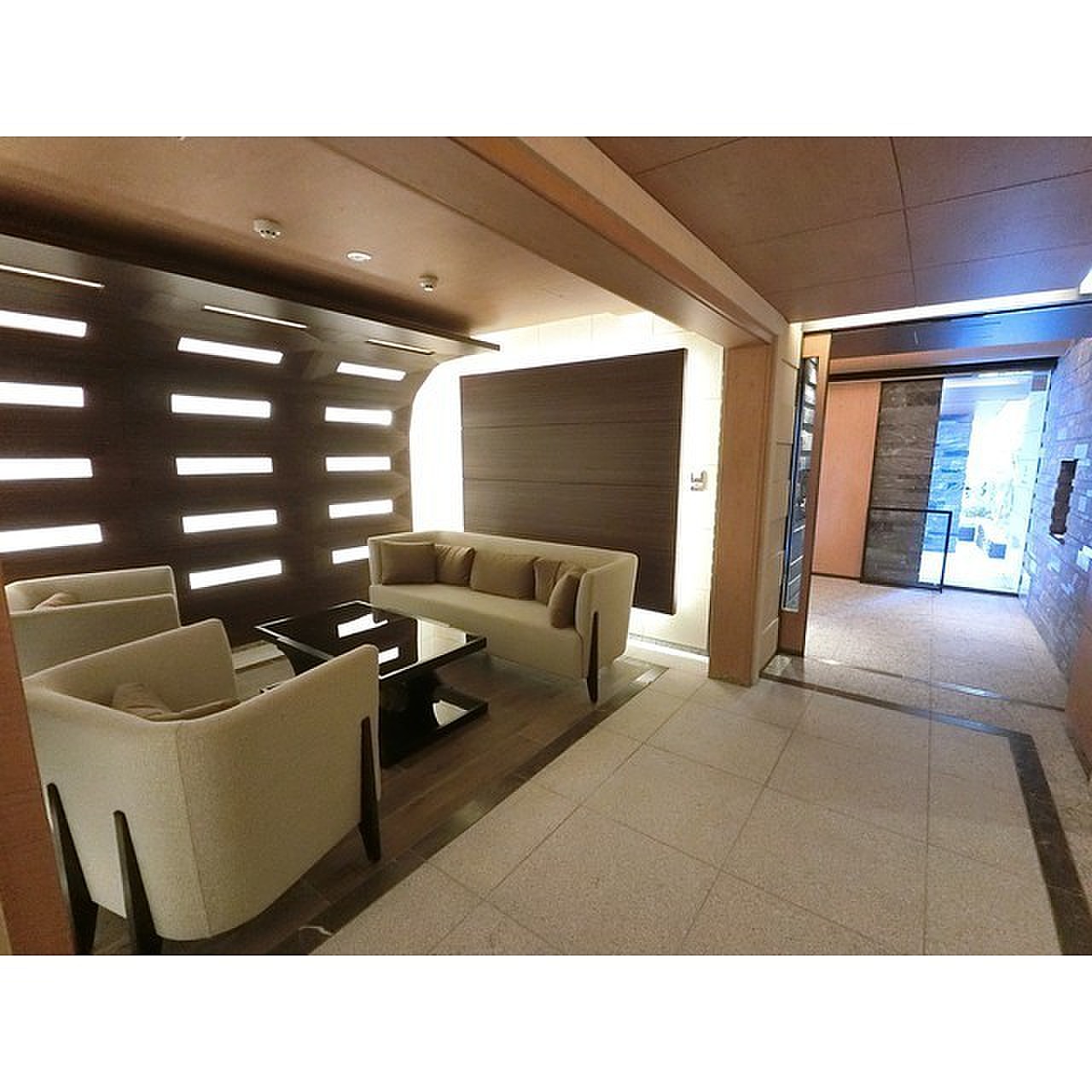 オートロックを通過すると、落ち着いた色合いのエントランスロビーがございます。