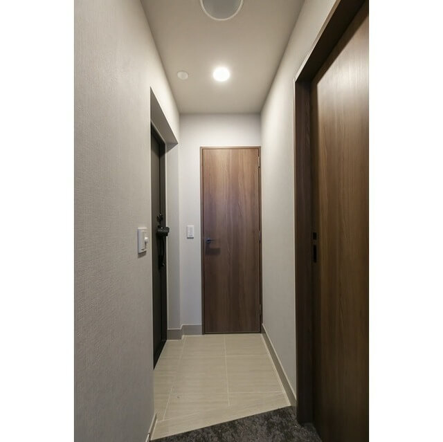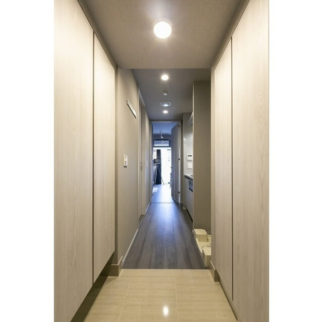 以下の通り、エレベーターホールから玄関ドアまでの共用廊下は、ホテルライクな内廊下の仕様となっています。