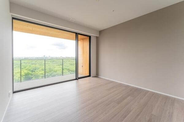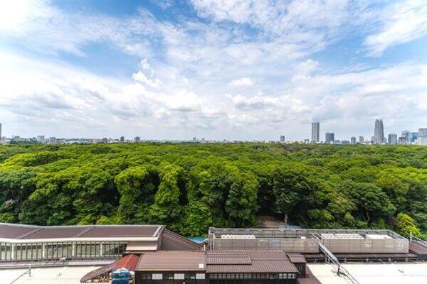 写真でもわかる通り視界を遮る建物がないことから、西向きなら以下のように明治神宮の緑を部屋から一望できます。